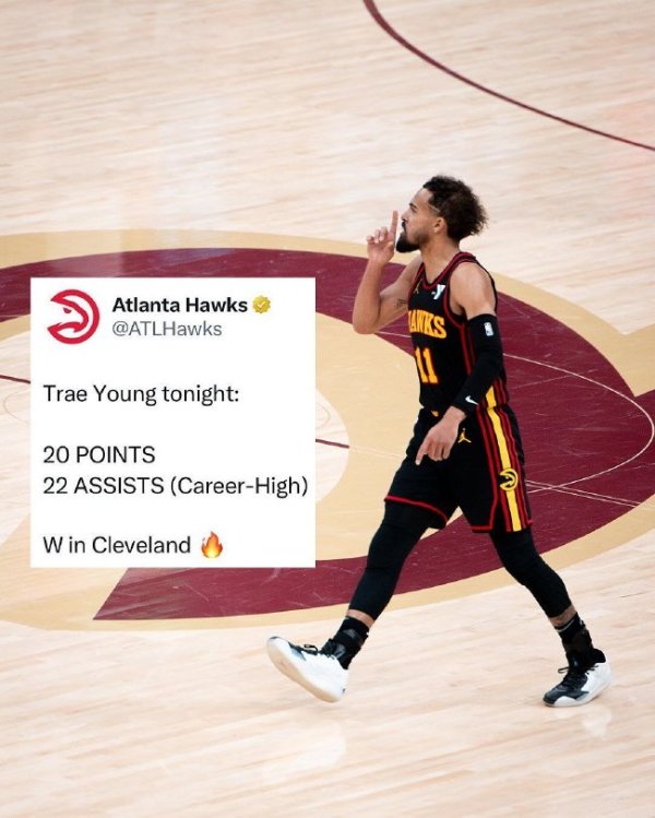 特雷-杨手感不佳18投仅6中,三分13中3,但送出22记助攻,创造NBA生涯单场助攻纪录。