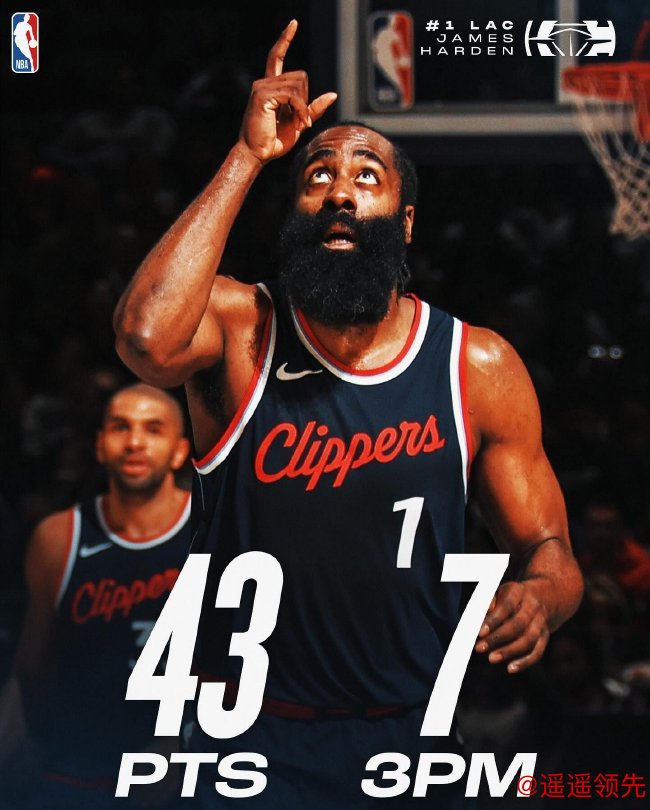 哈登首节爆砍23分,最终三节打卡,22投13中,三分11中7,罚球11中7,腾龙娱乐轰下43分4篮板7助攻3抢断,43分为哈登快船生涯得分新高。